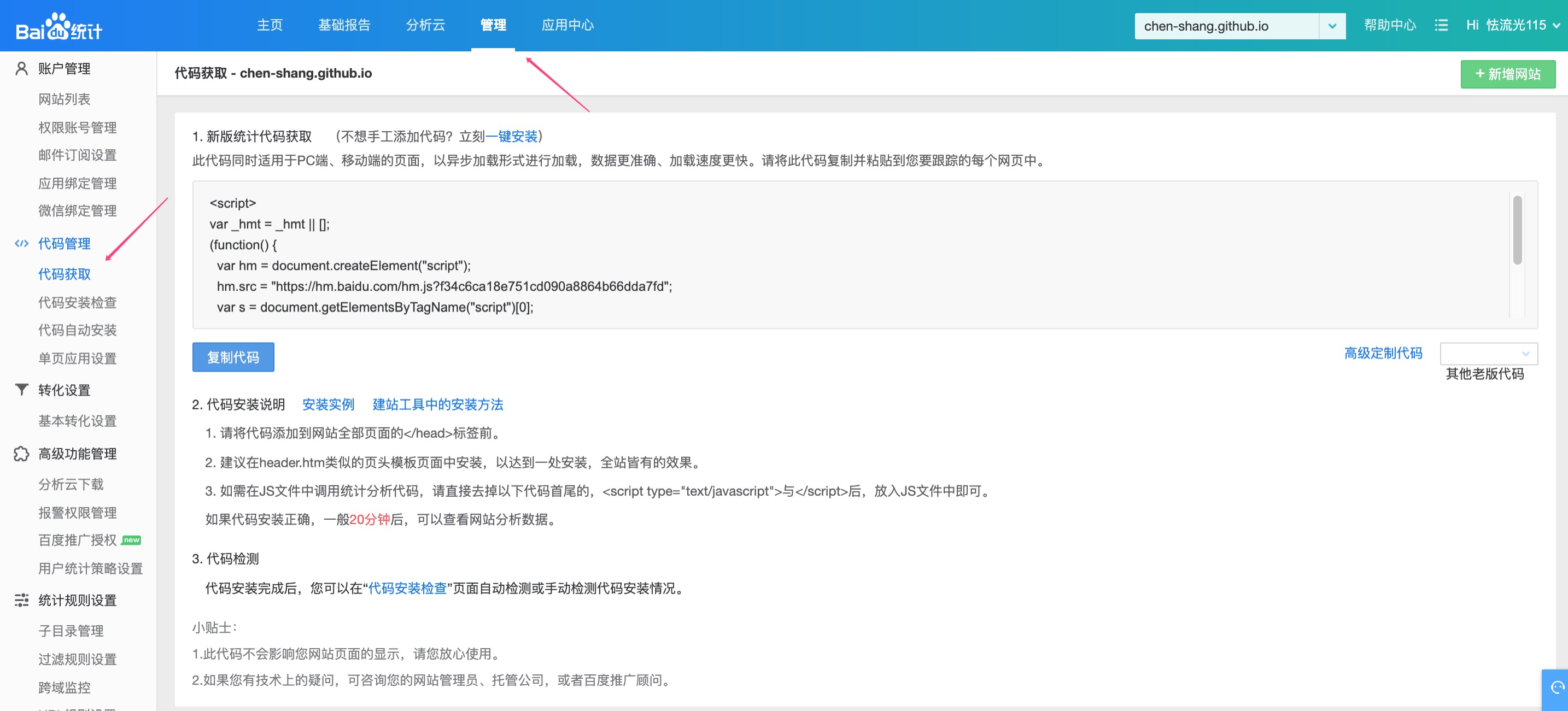 先去注册个百度统计账号,然后管理-代码管理里面可以看到安装方法