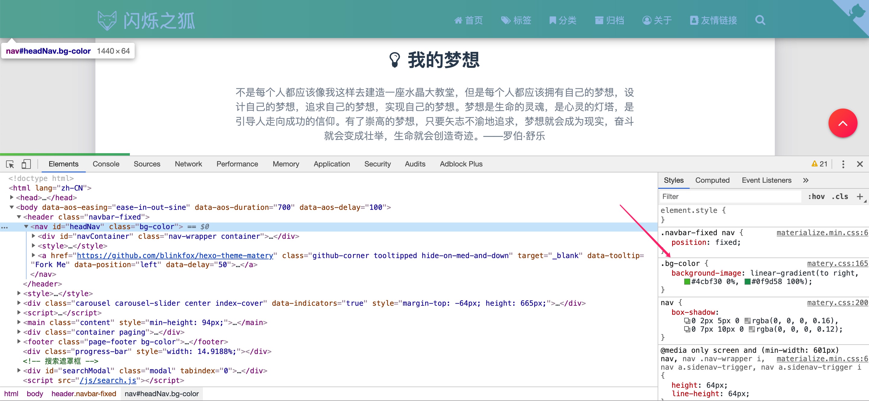 查找方法基本就是打开chrome浏览器的检查,选择想要查看的页面元素,然后看他的Style文件,找到关键词之后去hexo-theme-matery主题的css文件中查找后修改即可,这个基本没什么难度。