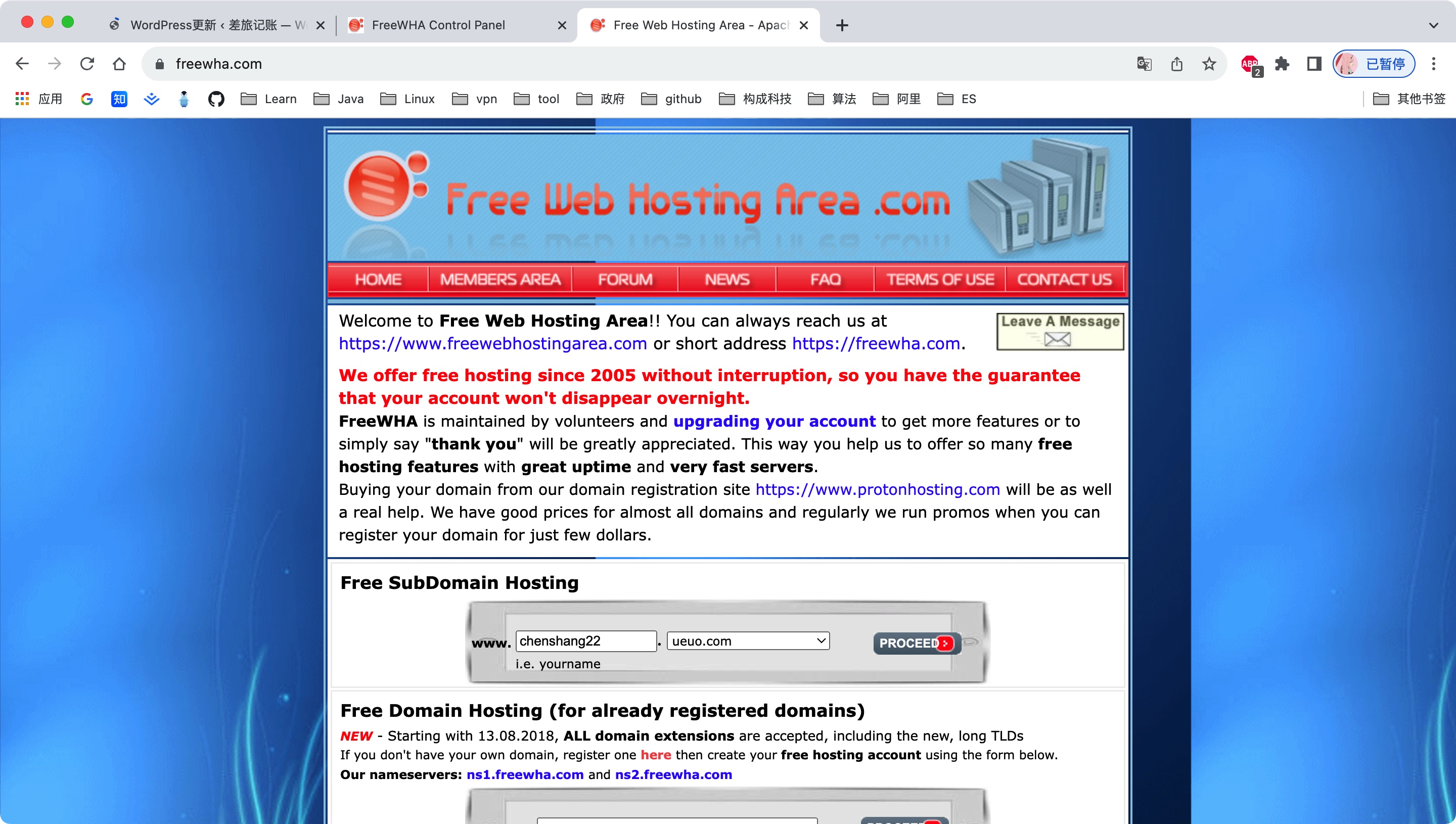好在那个年代有一批免费的服务器可以在网上申请得到,当时用的免费服务器是 https://ramses.freewha.com/ 这个. 这个居然还活着