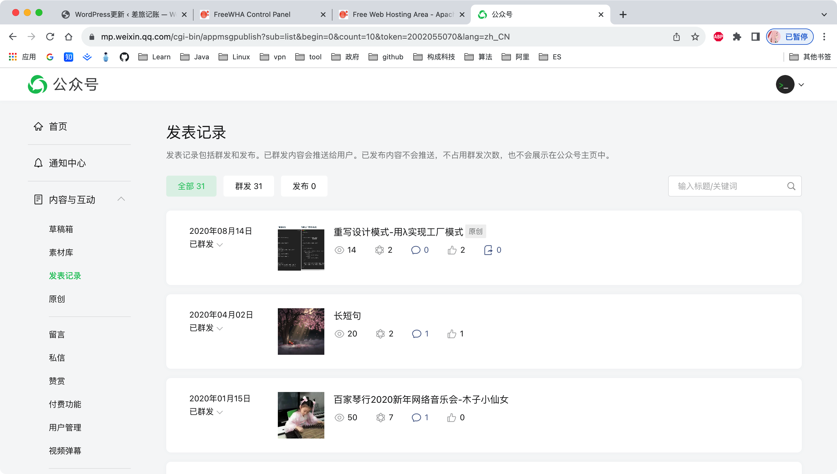 想想自己已经写了快5年了,汇聚成这么些年的技术总结这个网站,后来微信公众号比较流行,又搞过一段时间的微信公众号也叫这么些年的技术总结,旨在记录自己在工作中遇到的技术问题和答案以及自己的反思。 微信公众号大概长这个样子。 后台大概长后面那个样子。