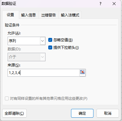 - 在验证条件里面,允许选择序列,然后来源中使用逗号分割的形式将这个单元格下来列表中的可选值填上就好