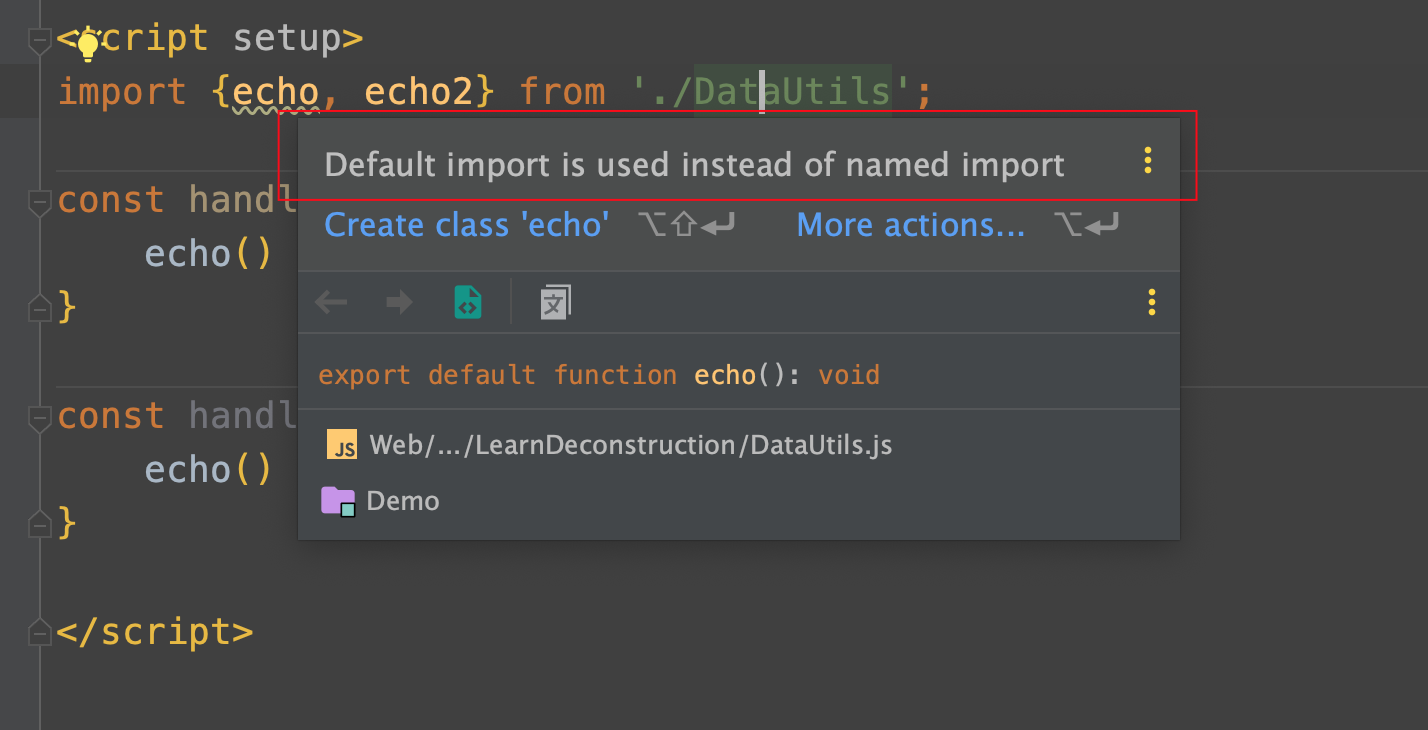 一个模块可以使用 default 关键字导出一个默认的值,并且默认的导出在导入时可以随意命名。如果使用默认导出,可以在一个模块中只导出一个默认功能。当一个模块只需要导出一个功能时,可以使用默认导出。使用默认导出时,在导入该功能时可以就不用加{}了。{} 属于命名导出,其本质是解构语法。否则idea也会有提示。