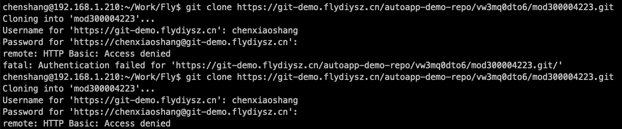 fatal: Authentication failed for 'https://git-demo.flydiysz.cn/autoapp-demo-repo/vw3mq0dto6/mod300004223.git/'