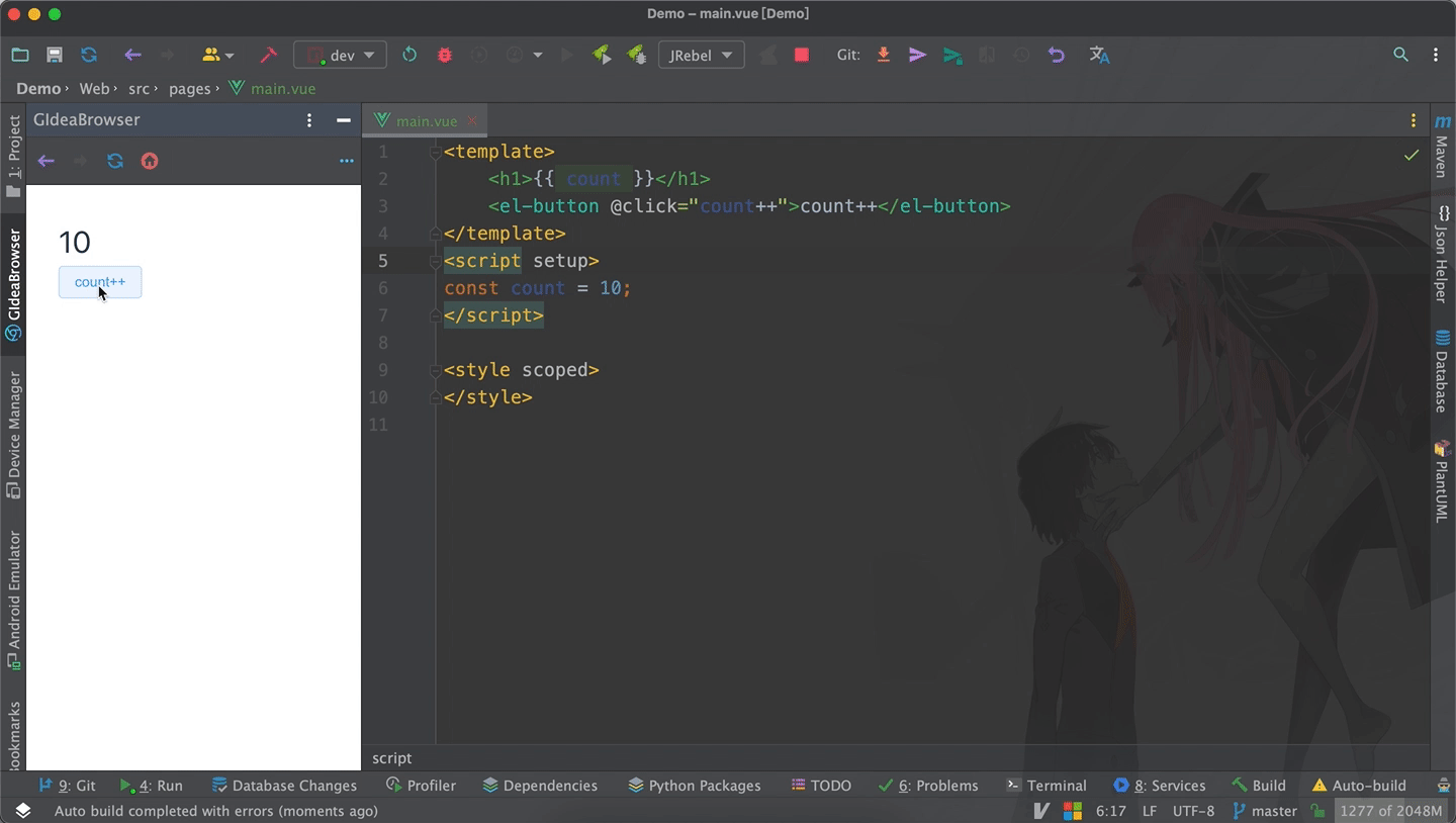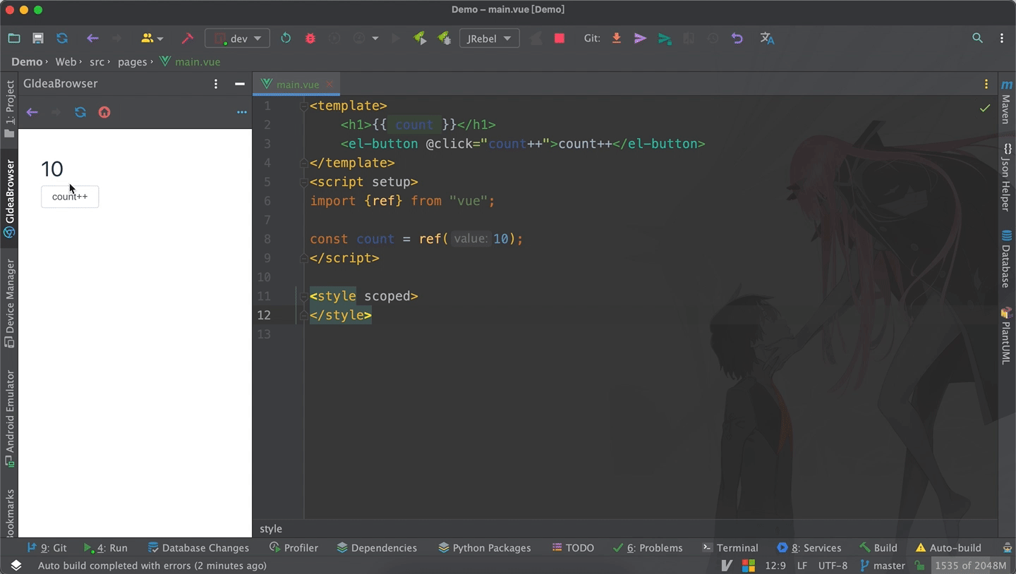而 如果 我们 使用 ref() 这个 函数 来定义 一个变量 ,那么 当我们再次点击 count++ 按钮的时候 ,h1 标签里面的值就会自动跟着变了。这就是 响应式 最基本的 表现形式 之一。