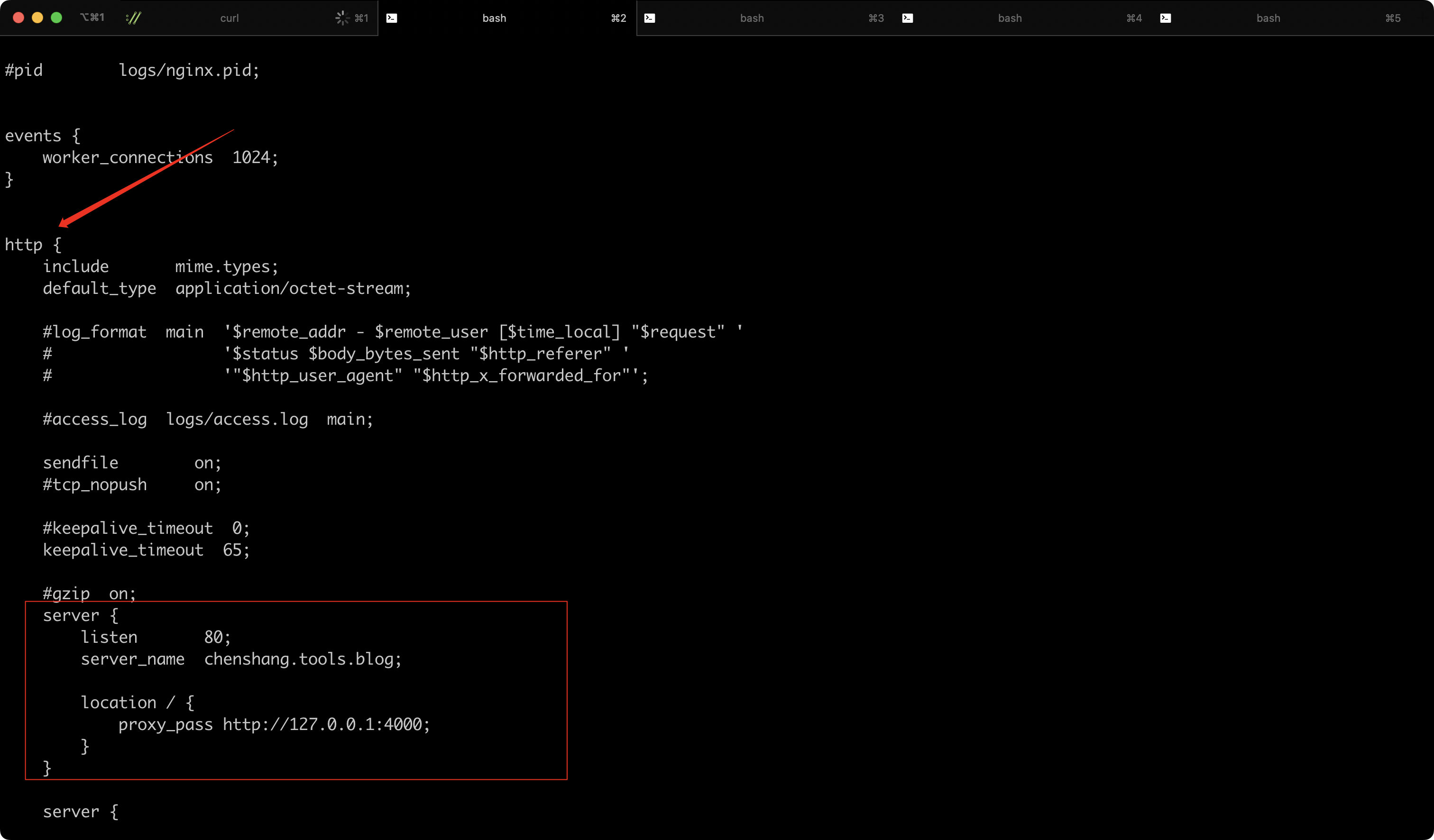 总体来说,这段 Nginx 配置的作用是:当有客户端访问chenshang.tools.blog域名的 80 端口时,Nginx 会将所有请求转发到本地的 4000 端口上运行的相关服务。