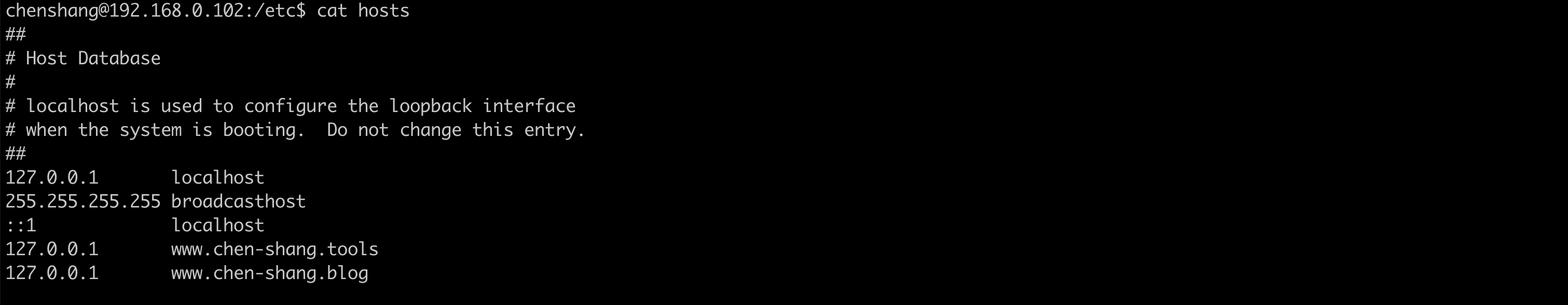 这句话的意思就是说 当浏览器遇到这个域名www.chen-shang.blog的时候,你就访问127.0.0.1这个ip,而这个ip就是我们的本地ip地址,也就是 localhost。