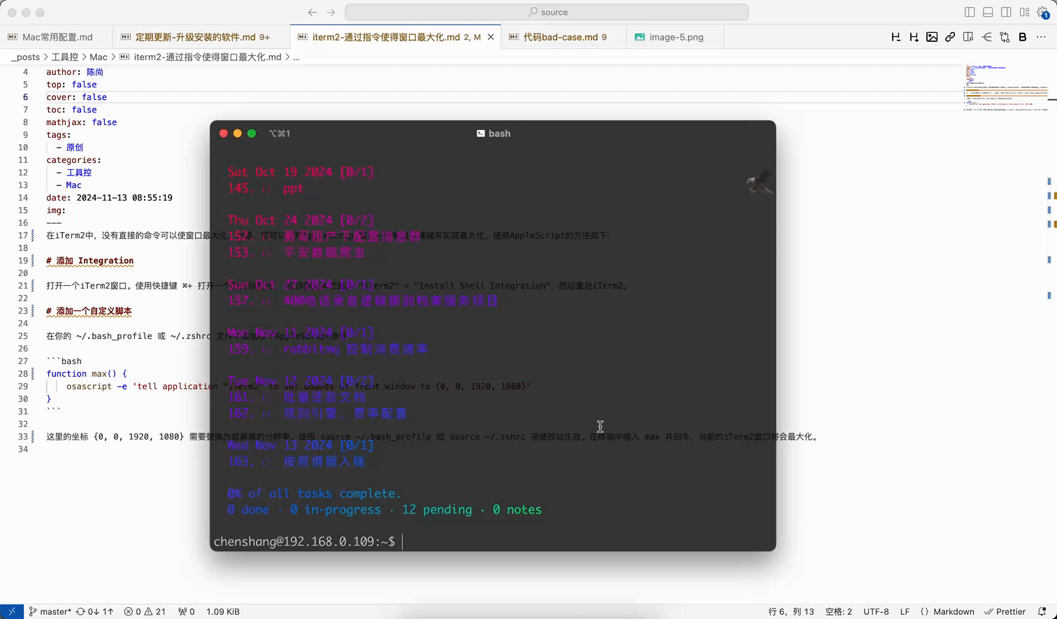 这里的坐标 {0, 0, 1920, 1080} 需要替换为您屏幕的分辨率。使用 source ~/.bash_profile 或 source ~/.zshrc 来使改动生效。在终端中输入 max 并回车,当前的iTerm2窗口将会最大化。