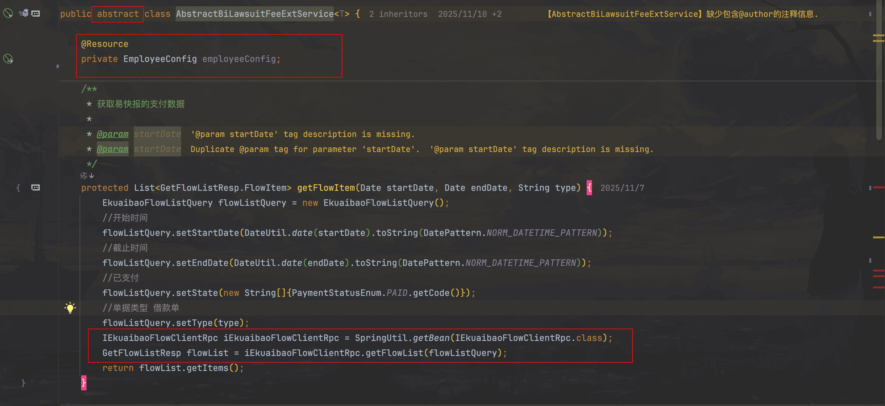 • 抽象类 AbstractBiLawsuitFeeExtService 与 SpringUtil 强耦合:代码必须依赖 Spring 容器才能运行,脱离 Spring 环境(如单元测试)则直接失效;
