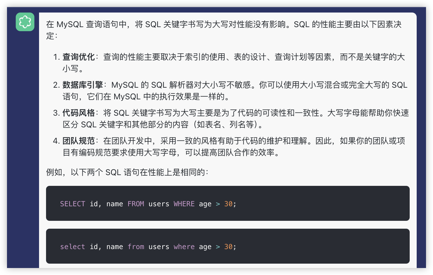 有同事写代码的时候,特意把sql语句全部大写了。说是Mysql会默认转大写,如果全部写了大写就不用转了,提高性能。
