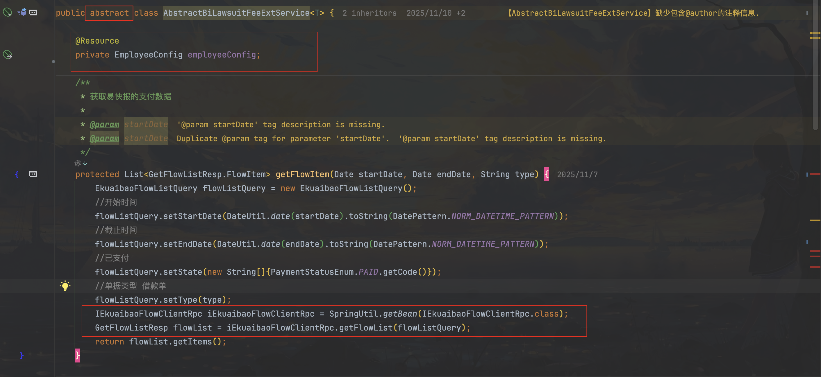 - 抽象类 AbstractBiLawsuitFeeExtService 与 SpringUtil 强耦合:代码必须依赖 Spring 容器才能运行,脱离 Spring 环境(如单元测试)则直接失效;