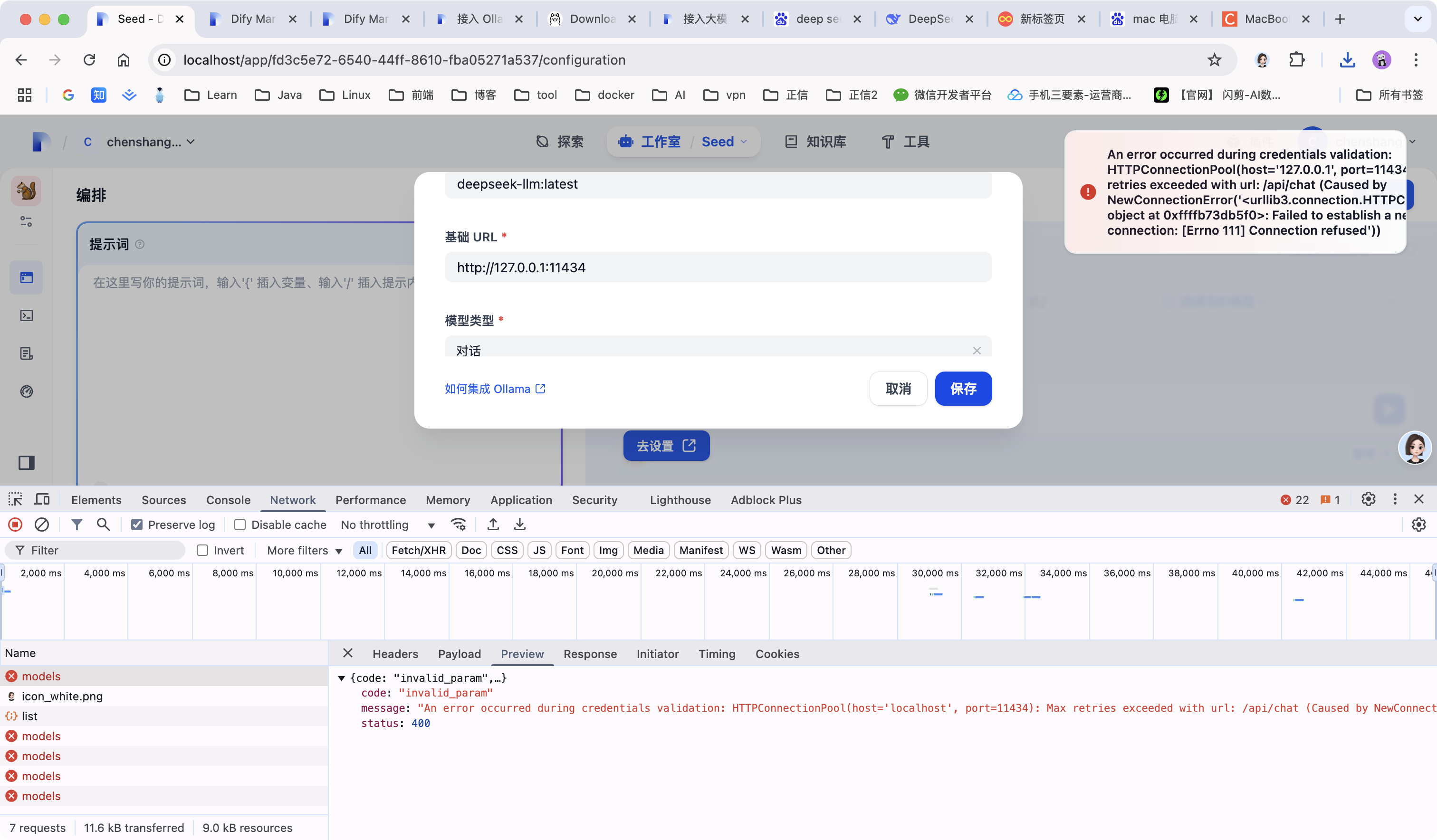 如果你使用 Docker 部署 Dify 和 Ollama,你可能会遇到以下错误: