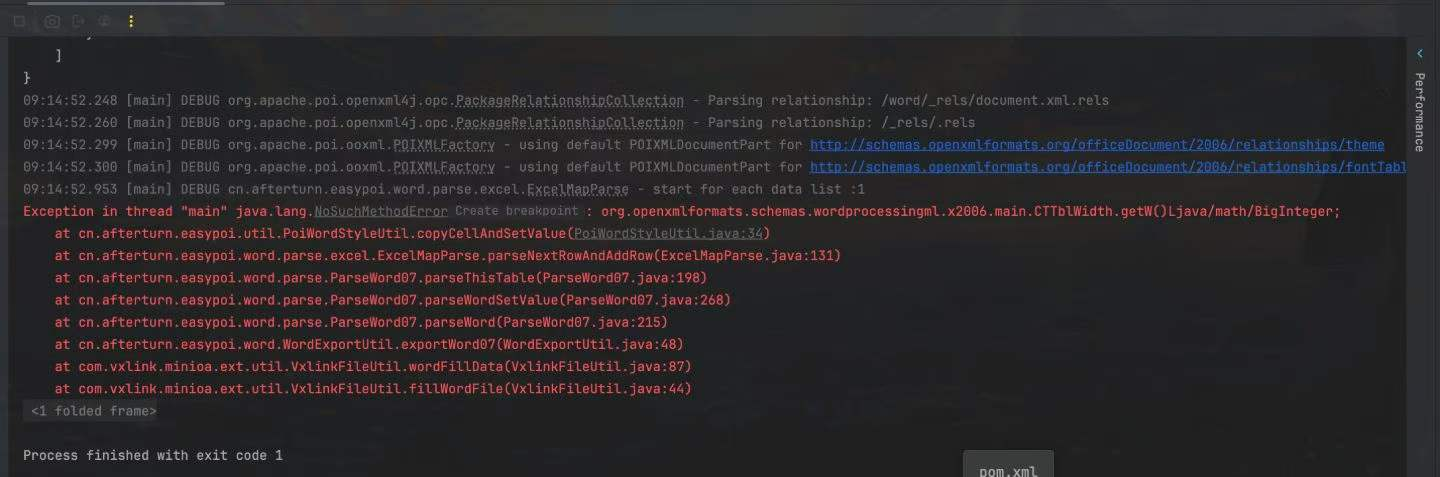 问题描述:执行Word模板填充功能时,使用EasyPoi库导出Word文档失败,抛出 NoSuchMethodError异常。