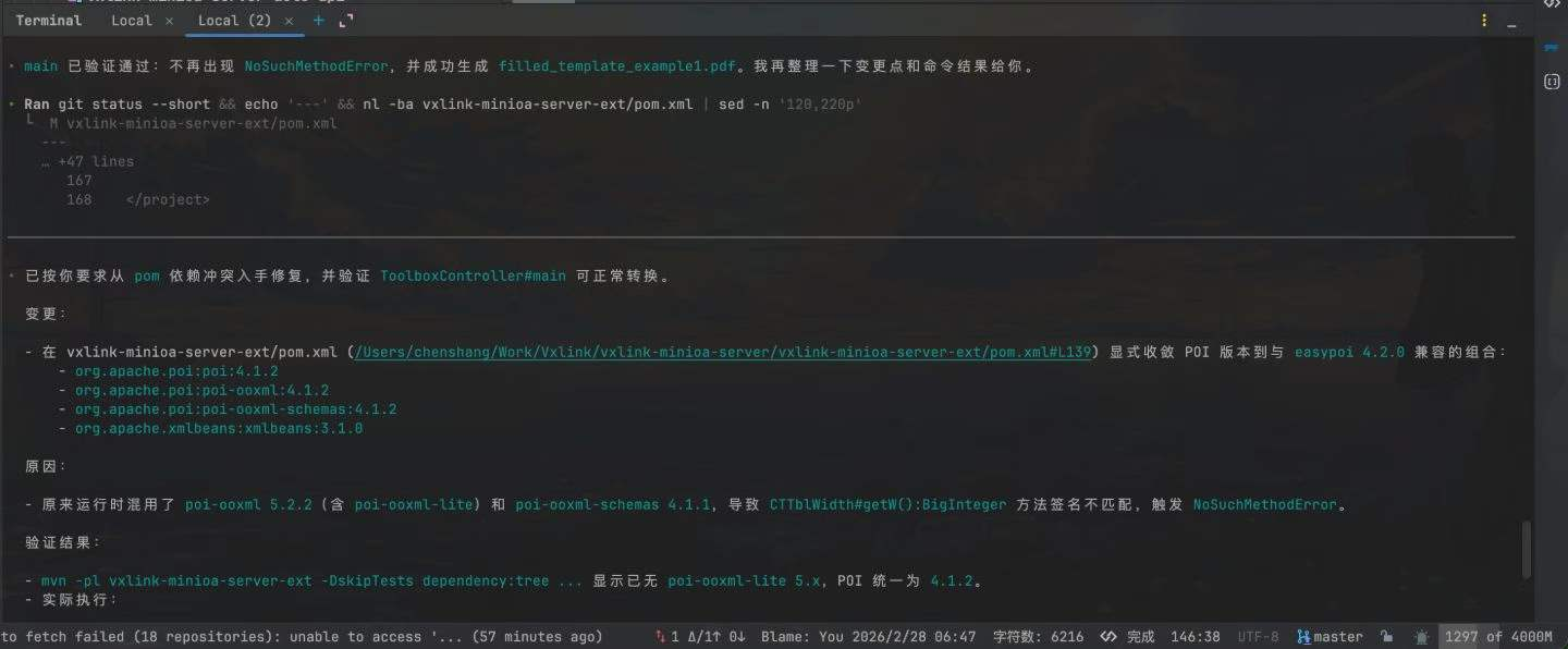 AI分析错误日志,定位是Apache POI版本冲突问题,查看pom.xml中相关依赖版本,锁定 openxmlformats库版本不兼容,排除冲突依赖,统一定义版本