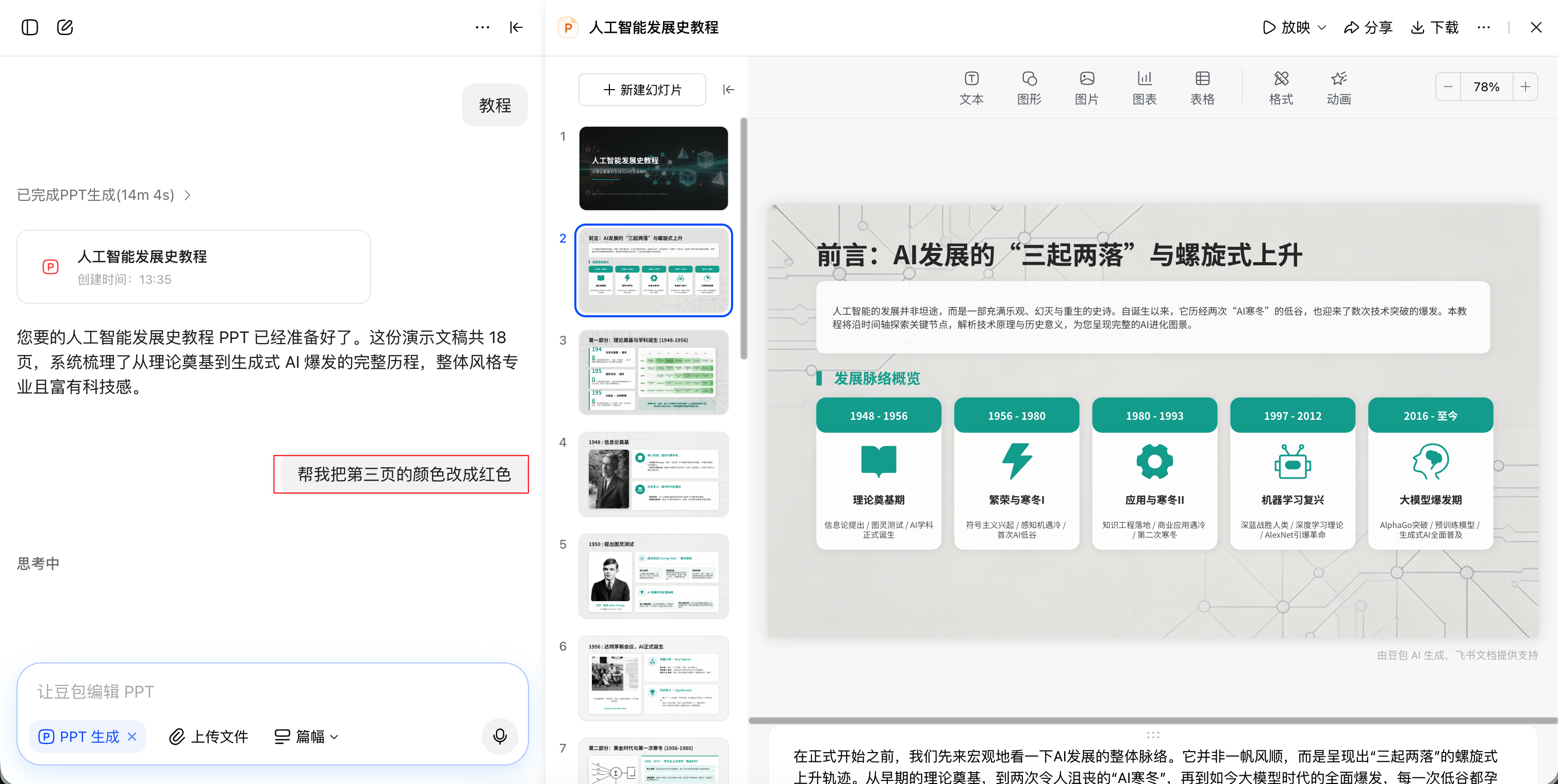 先给AI一个话题,然后在慢慢描述,最后产出一个PPT。